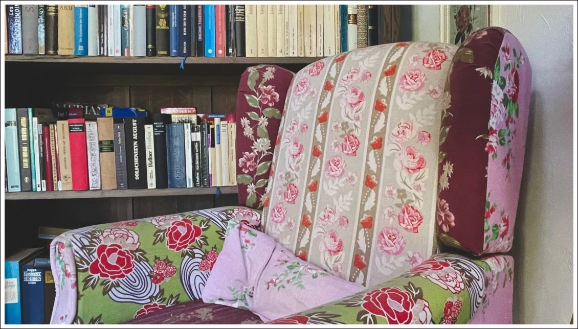 Zur Entspannung erstmal auf den Lesesessel. Urlaub halt. Draußen im Garten ist es noch zu frisch. Und Lesestoff gibts genug, auch viel Spannendes dabei.