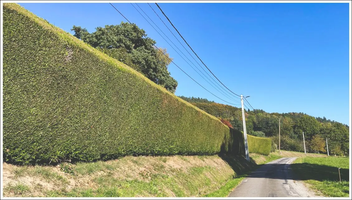Später noch eine kleine Hunderunde über eine der Hauptstraßen des Dorfes, mal schauen, wer derzeit beim innervogesischen Heckenschneidewettbewerb welche Punktzahl verdient hat. Der hier hat auf jeden Fall schon mal Ambitionen zumindest auf einen Anerkennungspreis, will mir scheinen, seine Hecke wirkt wie die Gebüsch-gewordene Berliner Mauer, nur ingesamt ein bisschen freundlicher. Ich bin beeindruckt. Und frage mich, ob die Männer hier (Gendern nicht nötig) mit Wasserwaage arbeiten, oder ob auch schon mal Nagelschere oder Effilierkamm zum Einsatz kommen. Wir werden das weiter beobachten. (Vielleicht mal eine Fotoserie zur hiesigen allgegenwärtigen Heckensymmetrie machen, und dann Bezüge zur aktuellen gesellschaftspolitischen Lage herstellen, irgendsowas in der Art.)