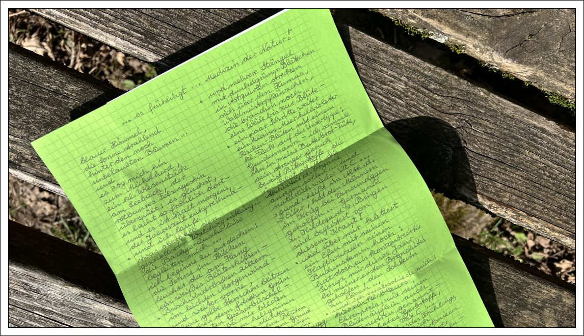 In der einsamen Weite der Landschaft am Fuße des Katzenbuckels begegnen wir einer älteren Frau, wir bleiben stehen und bewundern gemeinsam das Wetter, sie weist mich auf das erste blühende Scharbockskraut hin, von dem ich zuvor noch nie gehört habe. Mögen Sie Frühblüher? fragt sie mich und ich bejahe sicherheitshalber. Daraufhin schenkt sie mir ein kleines selbstgebasteltes Faltblatt mit Gedanken und Informationen zu Frühblühern, das ich auf einer Bank in der Sonne studiere. Kein Tag ohne Horizonterweiterung, – oder sagte ich das bereits?